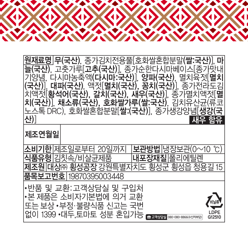 제품 제조 시점에 따라 원산지 변경으로 표시가 다르거나 유통기한으로 표시된 제품이 있을 수 있습니다. [정원e샵 고객상담실] 청정원 080-019-9119 / 종가 080-080-8866
