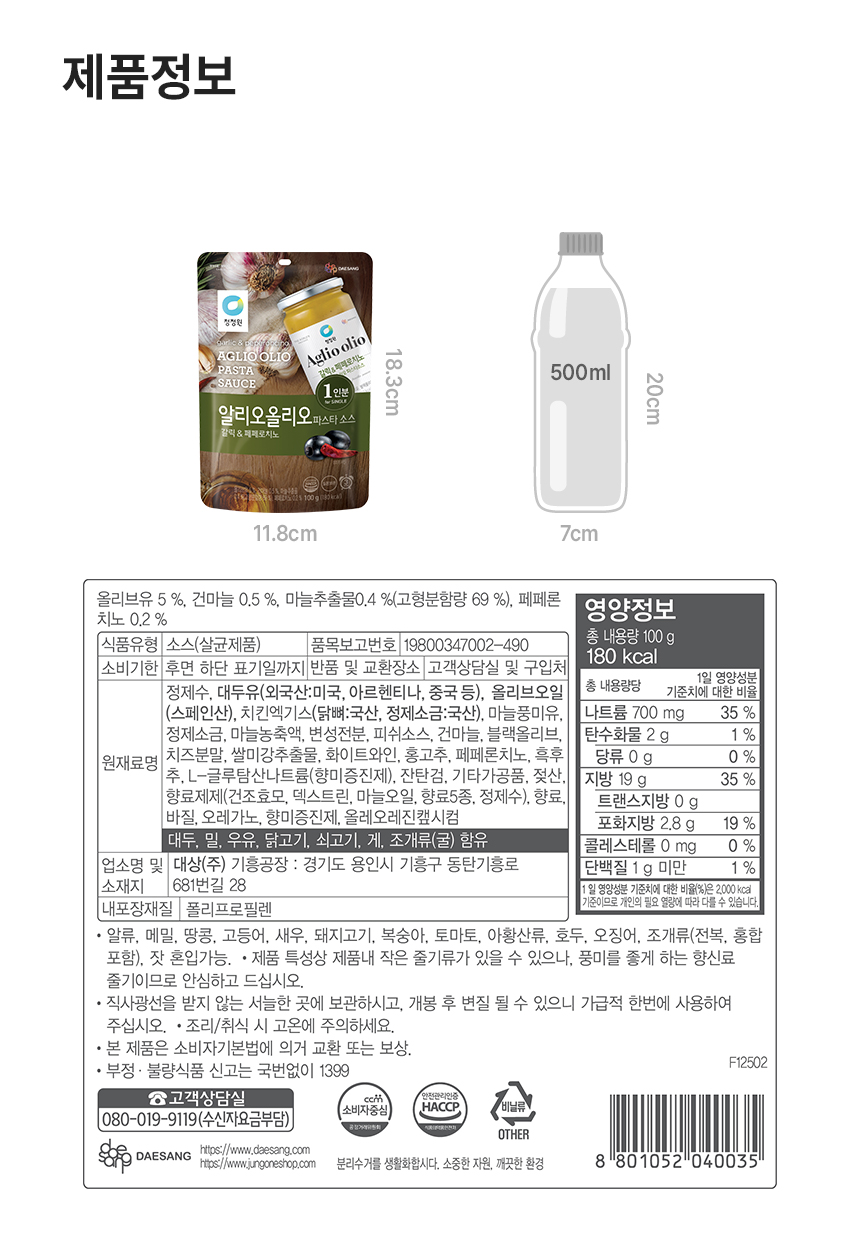 이미지 확대보기청정원 알리오올리오 파스타소스 1인분100g