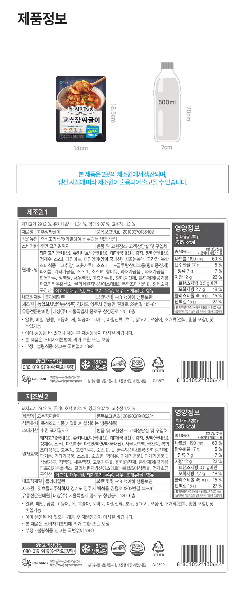 제품 제조 시점에 따라 원산지 변경으로 표시가 다르거나 유통기한으로 표시된 제품이 있을 수 있습니다. [정원e샵 고객상담실] 청정원 080-019-9119 / 종가 080-080-8866