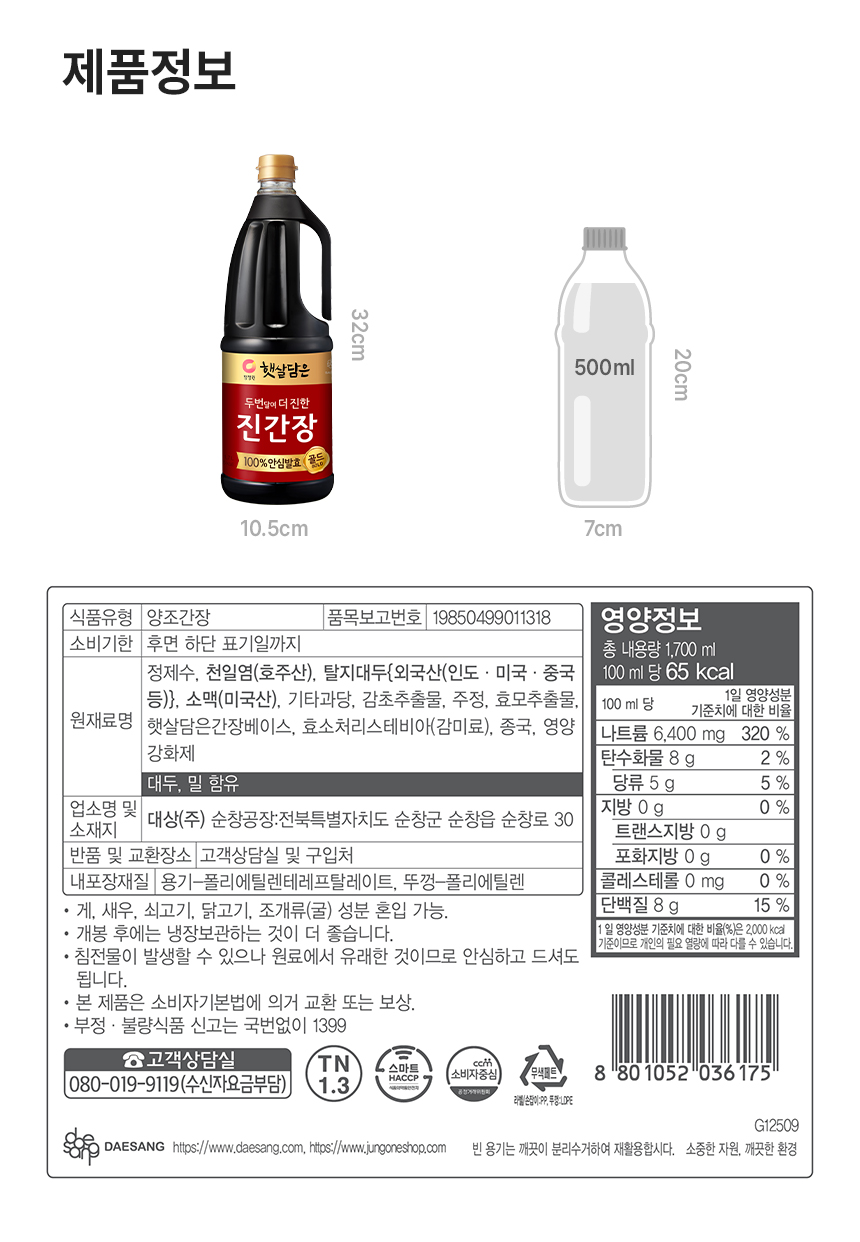 제품 제조 시점에 따라 원산지 변경으로 표시가 다르거나 유통기한으로 표시된 제품이 있을 수 있습니다. [정원e샵 고객상담실] 청정원 080-019-9119 / 종가 080-080-8866