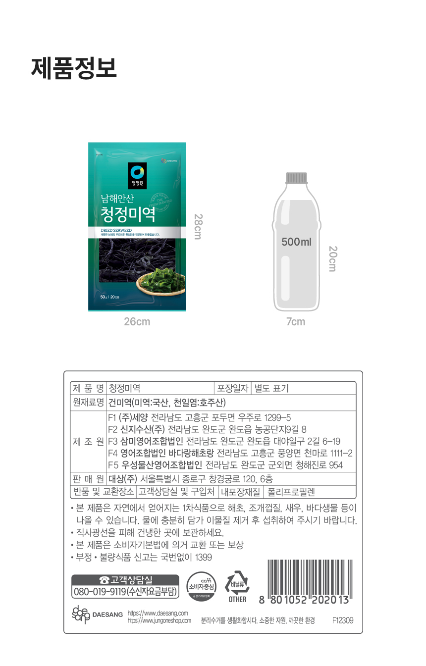 이미지 확대보기청정원 남해안산 청정 미역 50g(20인분)